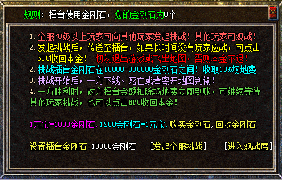 狂暴+转生系统+附魔系统+战宠系统+美酒系统+在线奖励+每日杀怪+每日签到,详情看土城右侧NPC 天下第一,神秘之战,每日奖励,装备分解,装备炼化等,详情看土城左上方 自动合成+自动回收(回收NPC上开启),自动捡取(狂暴为一键捡取,永久富豪自动捡取) 总之所有东西都在土城,每个NPC都很详细,这里就不一一解释了。 ↓↓↓个人比武擂台↓↓↓ ↓↓↓多人行会擂台↓↓↓