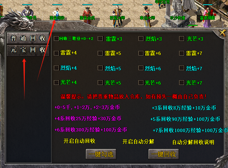 +8+9+10可回收元宝,元宝2-1寄售。详情看回收NPC,
