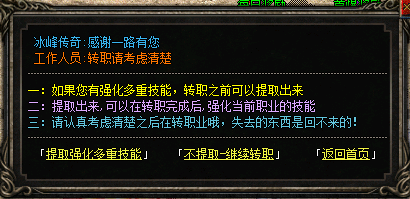 转职在土城左上角万能服务员,转职有高级技能的会赠送对应职业的技能,如战士有开天斩转法师会送流星火雨, 技能有强化三重以上的转职前可以提出来,详情看万能服务员-转职服务-提取强化多重技能介绍。 群攻技能转职跟随人物职业自动修炼,如战士有地丁转职成法师后上线会修炼群体雷电书。 ↓↓↓万能服务员-转职服务↓↓↓。